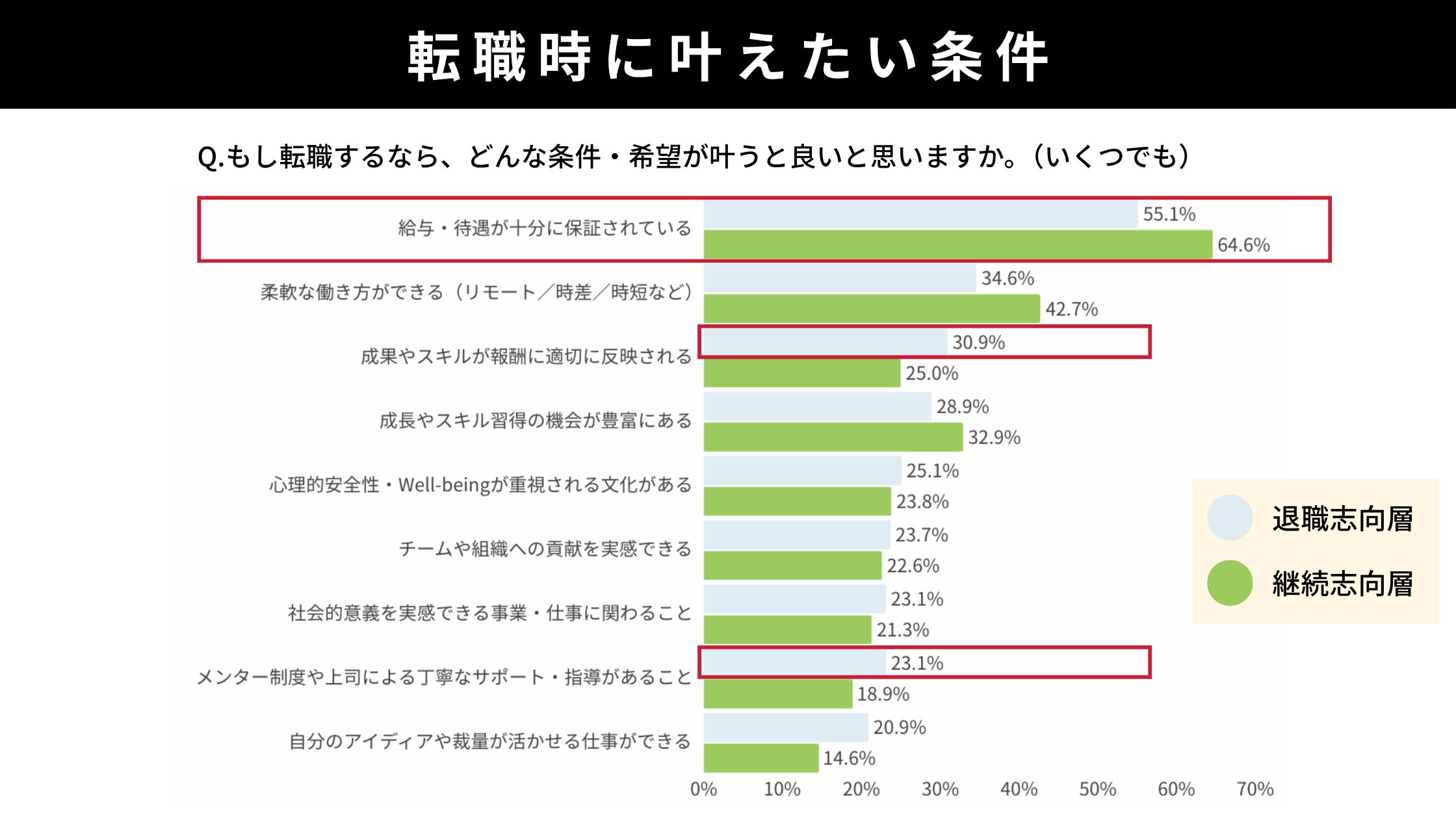 傾向として、継続志向層は働き方の柔軟性や育成を相対的に重視し、退職志向層は成果・スキルの報酬反映に加えて、メンター制度や上司によるサポートへのニーズが高いことが分かります。