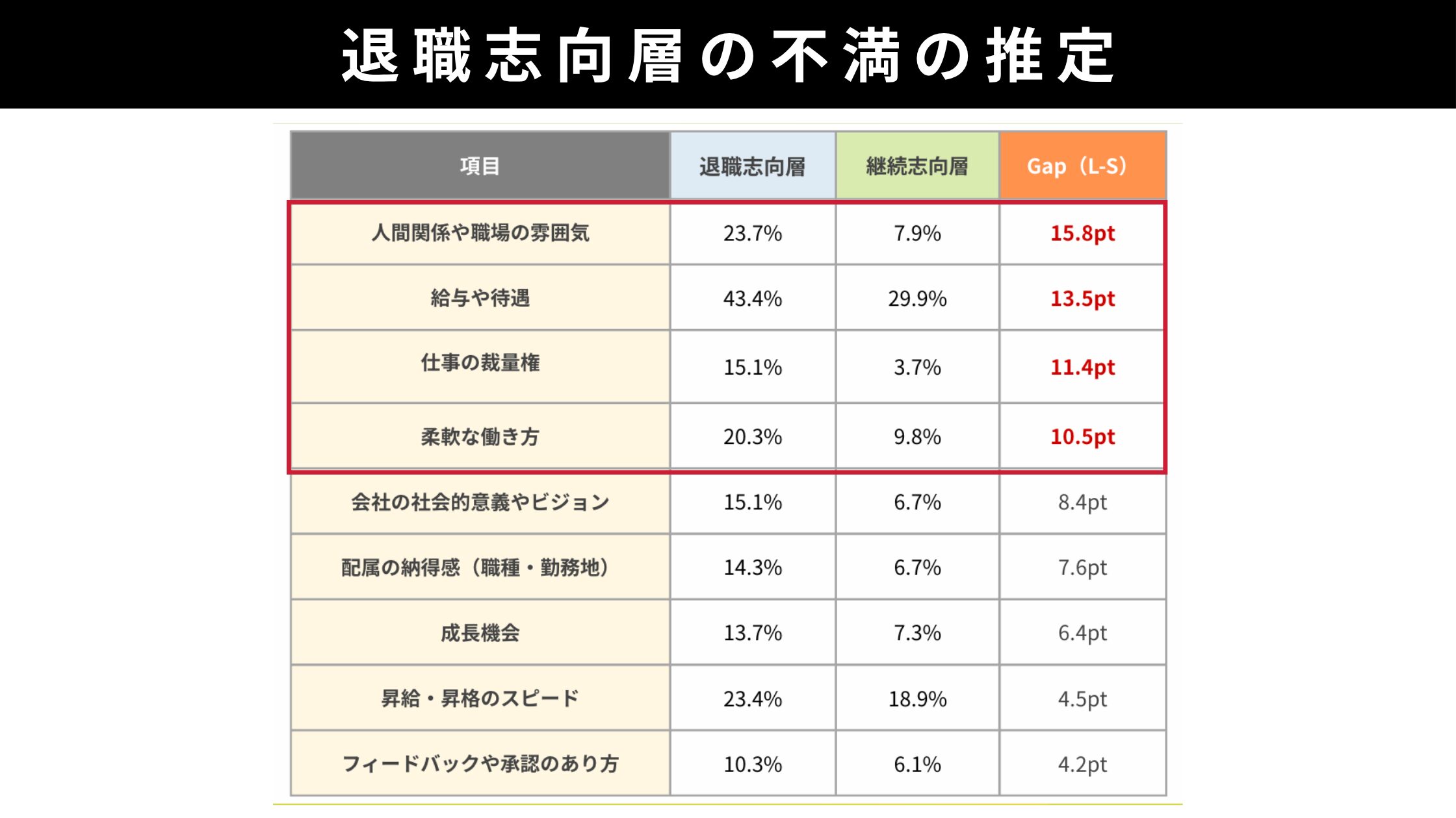 退職志向層と継続志向層を比較すると「人間関係・雰囲気」「給与・待遇」「仕事の裁量」「柔軟な働き方」でそれぞれ10pt以上の差がありギャップが際立ちます。
