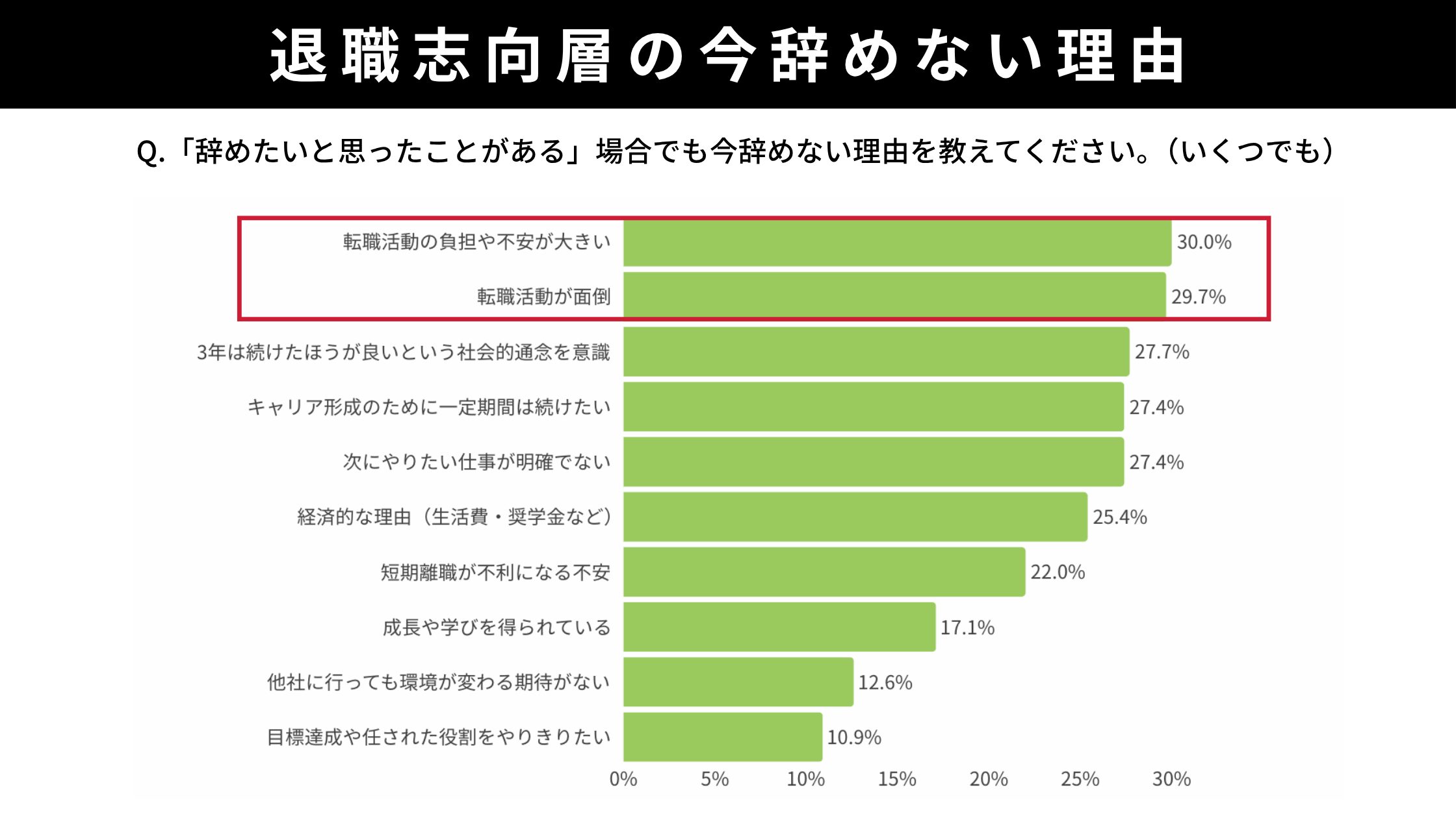 退職志向であっても今すぐ退職に踏み切らない理由は、転職活動の負担・不安(30.0%)と手間の大きさ(29.7%)が上位。その次に、社会的通念としての「3年は続けた方が良い」(27.7%)、キャリア形成のため一定期間は続きたい(27.4%)、次にやりたい仕事が不明確(27.4%)が続きます。