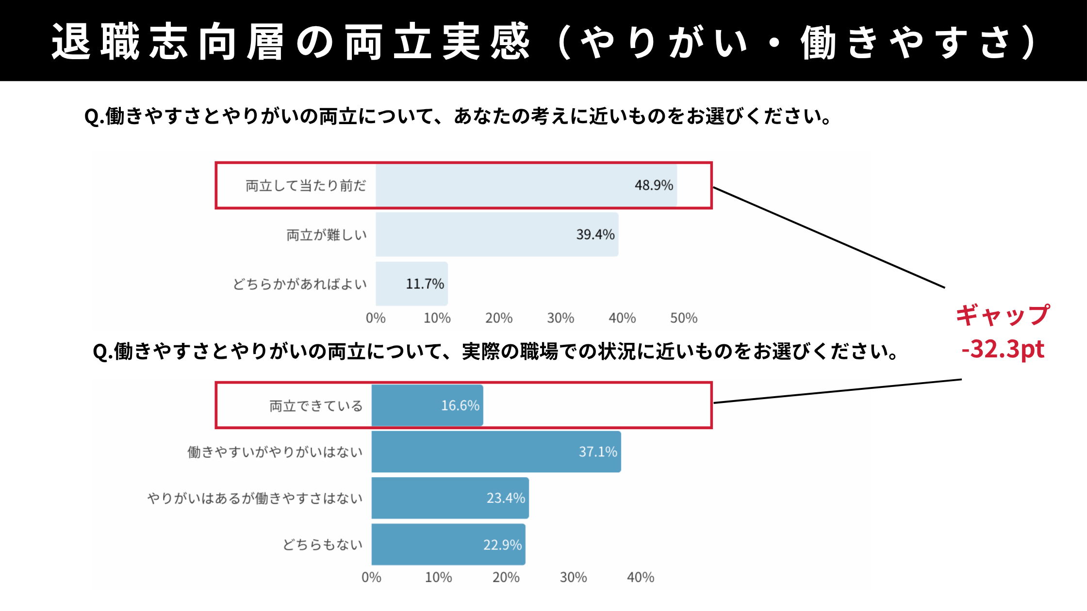 退職志向層の不満は「待遇・昇進・裁量」などやりがい側に偏っていたため、「働きやすさ」「やりがい」の両立実感を確認したところ、両立できている(16.6%)は下位にとどまり、ギャップは −32.3ptで乖離が大きくなっています。