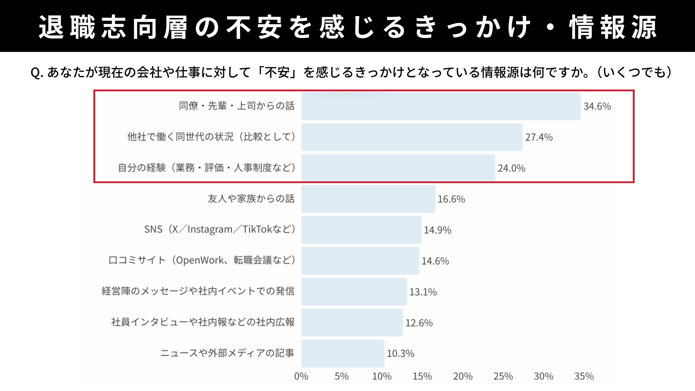 抱えている不満や不安は、どの情報に触れることで強まったり緩和されたりしているのかを確認したところ、不安を感じるきっかけは同僚・先輩・上司の話(34.6%)が最多。他社で働く同世代の状況(27.4%)、自身の評価・制度体験(24.0%)が続きます。一方で、経営メッセージ(13.1%)や社内報・社員インタビュー(12.6%)は下位にとどまります。