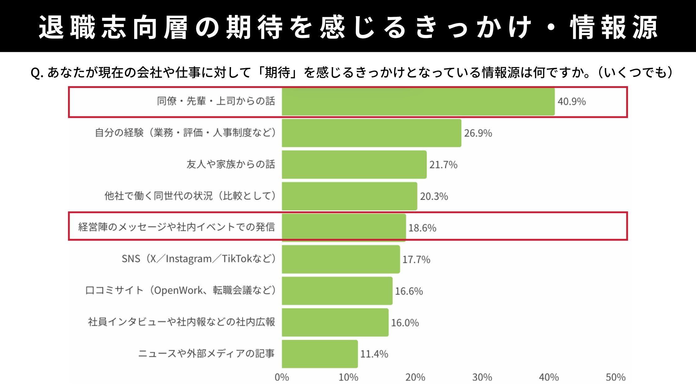 期待を感じるきっかけとなっているのも同僚・先輩・上司からの話(40.9%)が最も多く、次いで自分の経験(26.9%)、友人・家族(21.7%)、他社で働く同世代の状況(20.3%)が続きます。