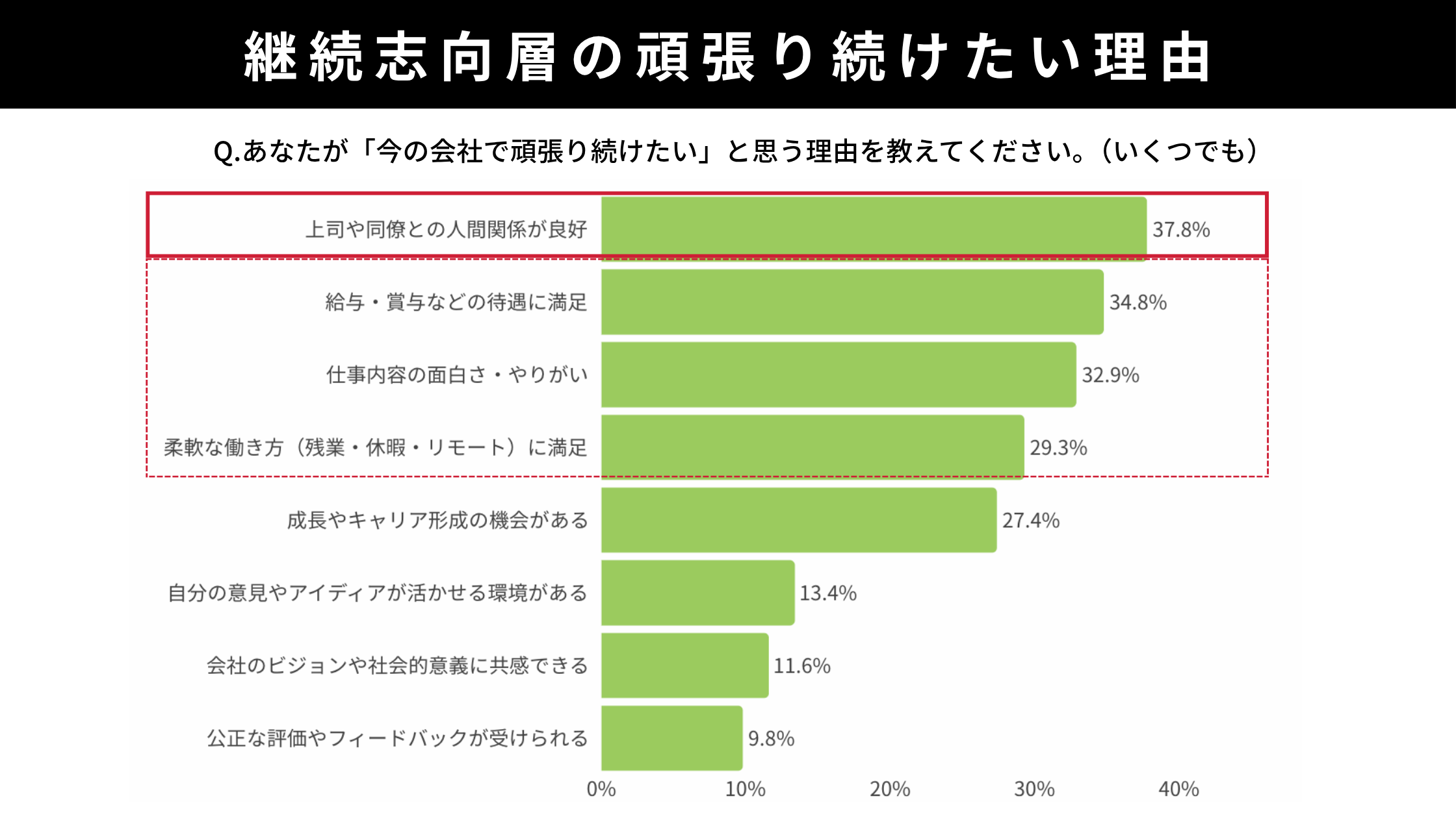 継続志向層が会社に残りたい理由は上司・同僚との関係が良好(37.8%)が最多。次いで給与・賞与など処遇への満足(34.8%)、仕事内容の面白さ・やりがい(32.9%)、柔軟な働き方への満足(29.3%)、成長・キャリア機会(27.4%)が続きます。