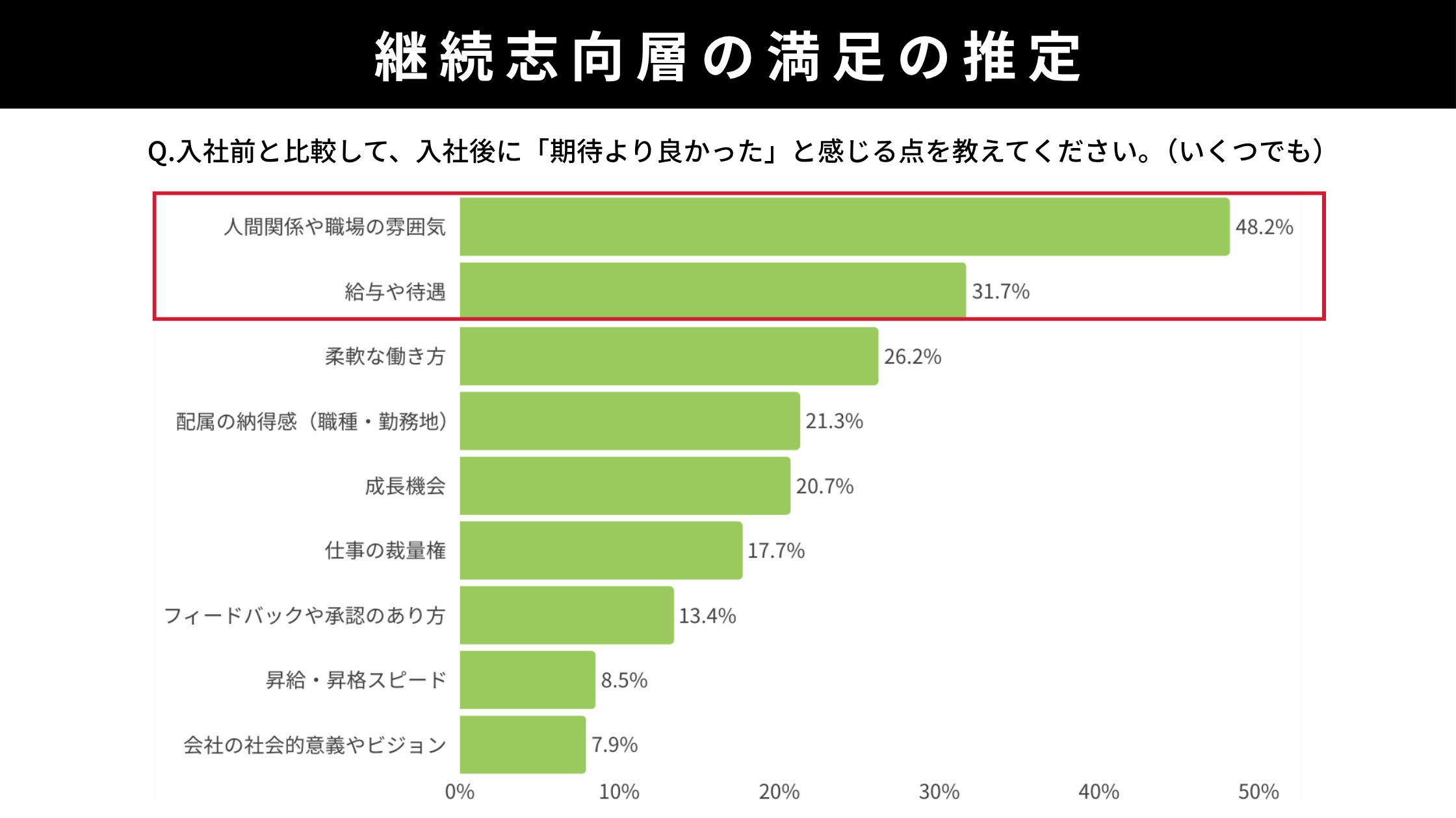 「期待より良かった」と感じる点は、人間関係・職場の雰囲気(48.2%)、給与や待遇(31.7%)、柔軟な働き方(26.2%)。次いで配属の納得感(21.3%)が続きます。