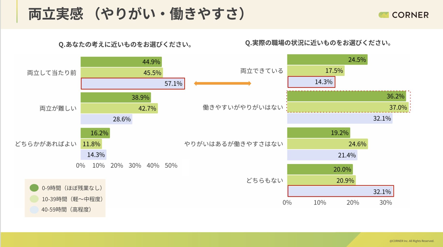 ・残業が増えるほど「両立を望む理想」と「体感」のギャップが広がる。