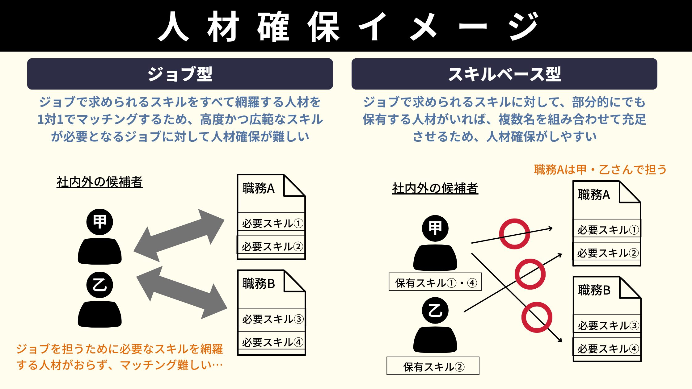 ジョブ型では仕事と人の関係性が1対1で固定化する一方、「スキルベース組織」では仕事と人の関係性が柔軟になります。そのため、特に『配置・異動(ジョブマッチング)』の観点で仕組みづくりなどの課題が大きくなると想定されます。