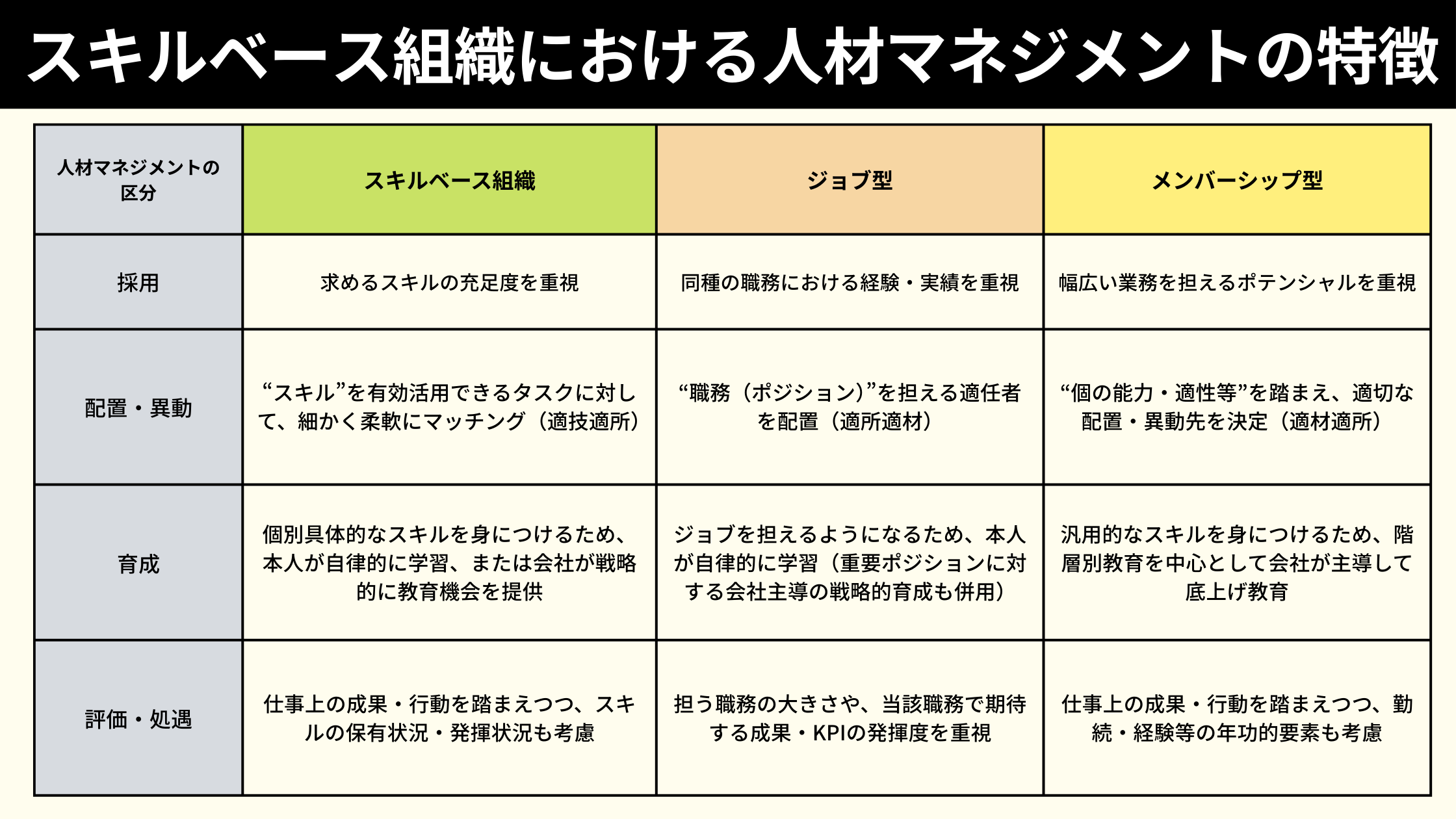 「スキルベース組織」の人材マネジメント(採用・配置・異動・育成・評価・処遇)は、ジョブ型やメンバーシップ型の考え方と比較すると『スキル』を中心に据えている点に特徴があります。その上でそれぞれの違いについて、以下4つの観点から比較してみます。