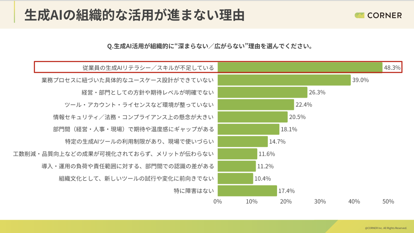 従業員のリテラシー/スキル不足が圧倒的に多く挙げられており(48.1%)、業務プロセスと紐付いた具体的なユースケース設計ができていない(39.0%)が次に多い。全体的には業務・組織設計に起因する要因が続いている。生成AIは導入されつつある一方で、それを組織の業務や意思決定に組み込む設計が追いついていない構造が確認できる。