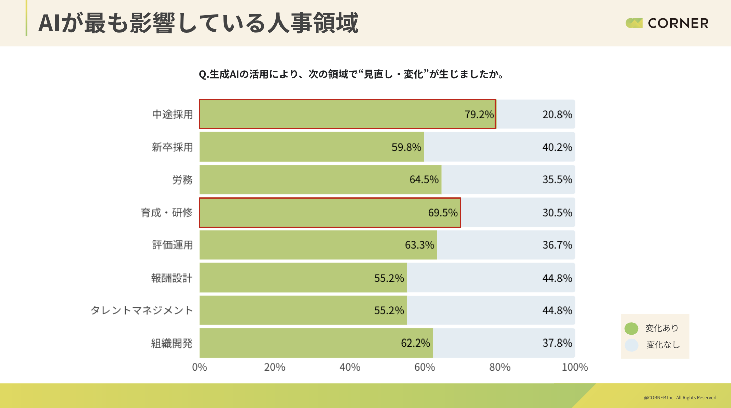生成AI活用により、どの人事領域で変化・見直しが生じているかを尋ねたところ、中途採用(79.2%)が圧倒的に多く回答が挙がり、育成・研修(69.5%)、労務(64.5%)が続く。業務負担の大きさが関係している可能性もある。一方、報酬設計・タレントマネジメントなど、制度・判断を伴う領域では相対的にやや低い。
