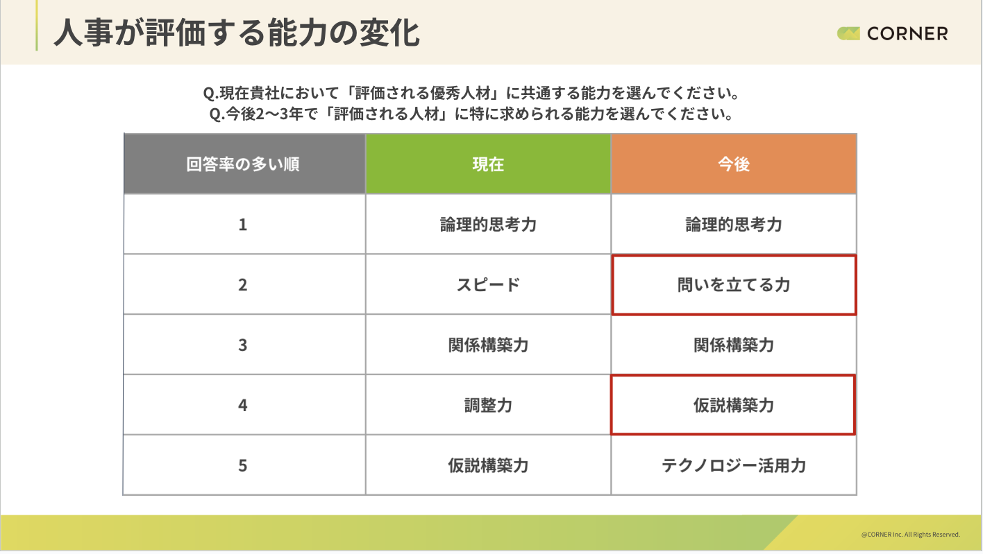 今後に向けてはスピードや正確性よりも、「問いを立てる力」「仮説構築力」といった人にしか担えない思考・設計能力が、今後の評価軸として浮かび上がっている。「テクノロジー活用力」も多く挙げられており、業務や判断の中でテクノロジーを前提に考えられる人材をどのように育成・配置していくかも、重要な論点になる。